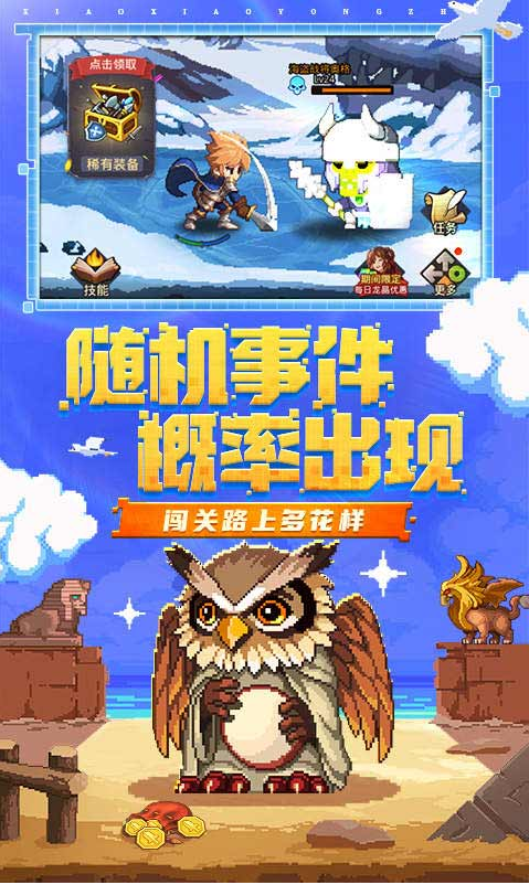 《小小勇者》是一款放置类游戏,游戏讲述了在魔物肆虐的灾厄年代里,年轻的勇者为了拯救家园而进发的冒险征途。在游戏中,玩家主要通过触发事件系统里出现的各种随机事件,从而与各种角色进行互动,打造强大装备、结识信赖同伴,