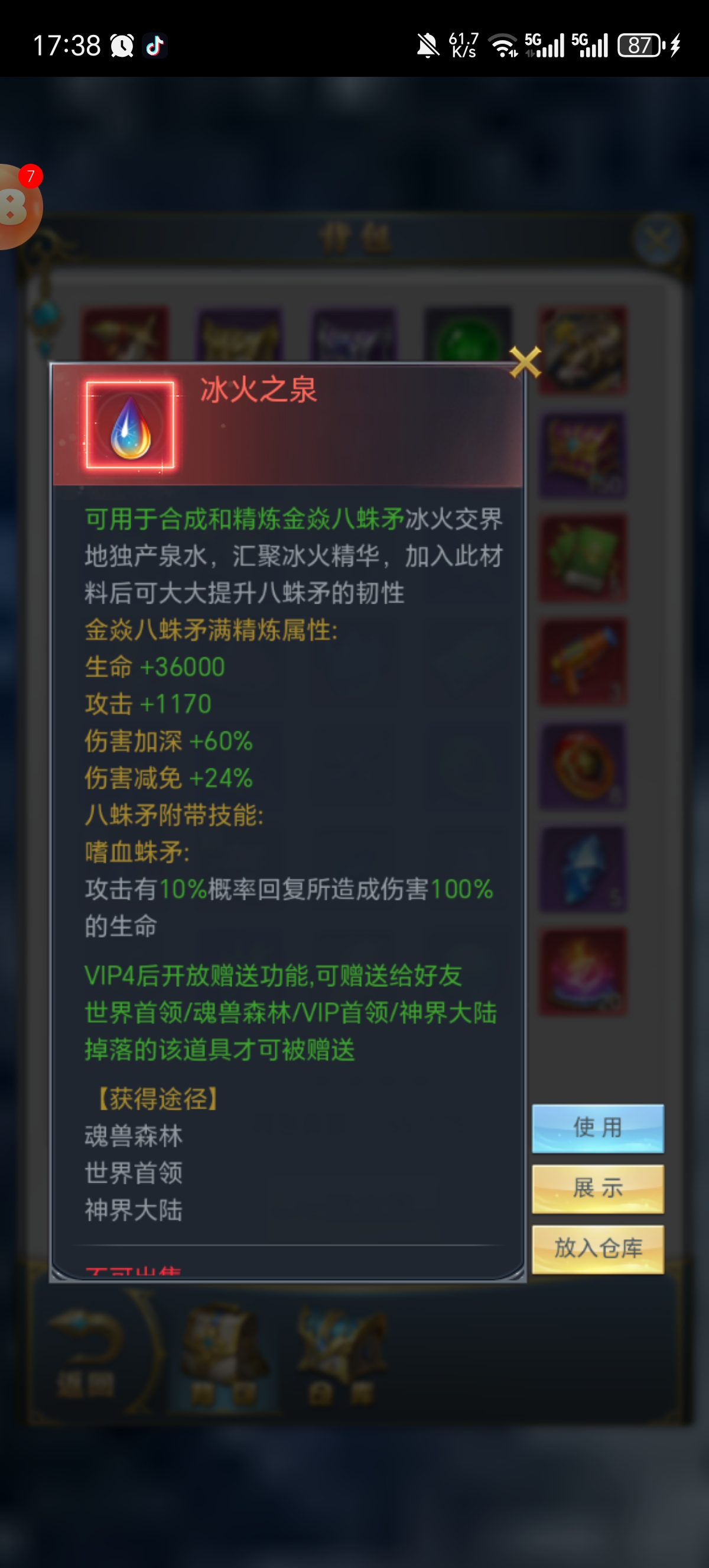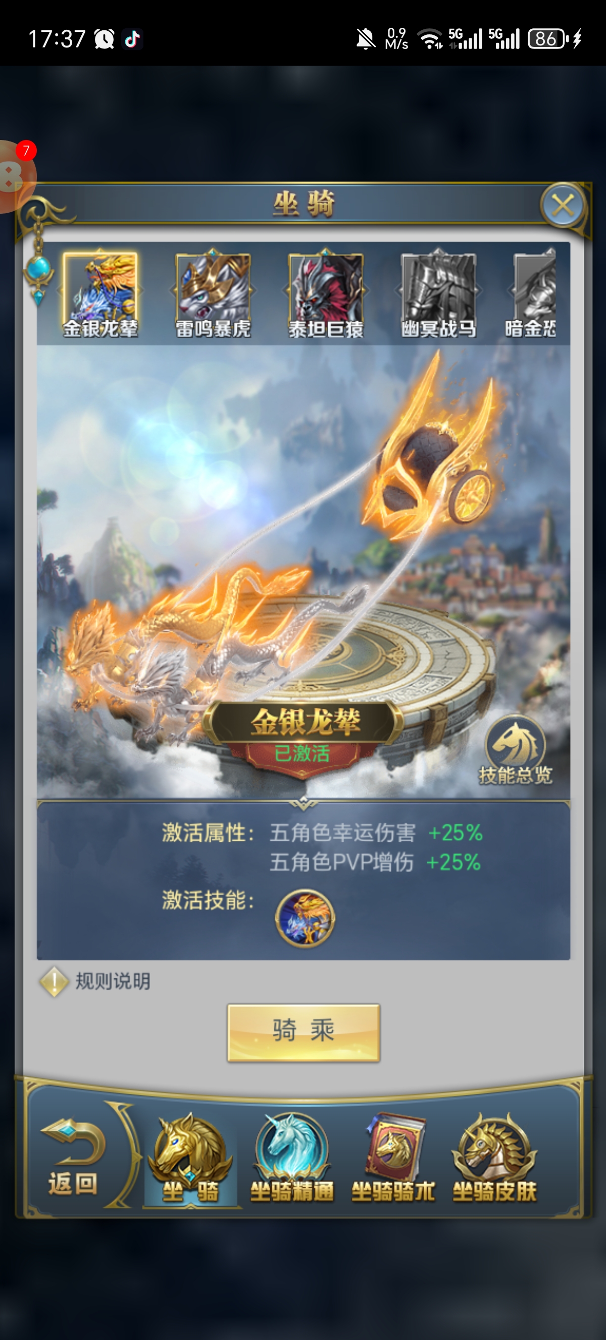 卖家描述: 极品满配号,坐骑多,皮肤多,凶兽活动全拉满,上手就能玩,永久宝宝,满精炼八蛛矛,各种特权全都买了。
