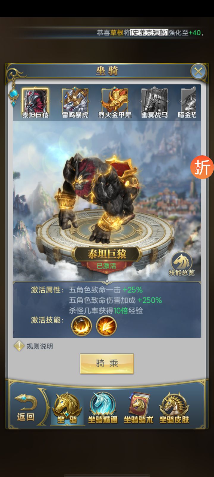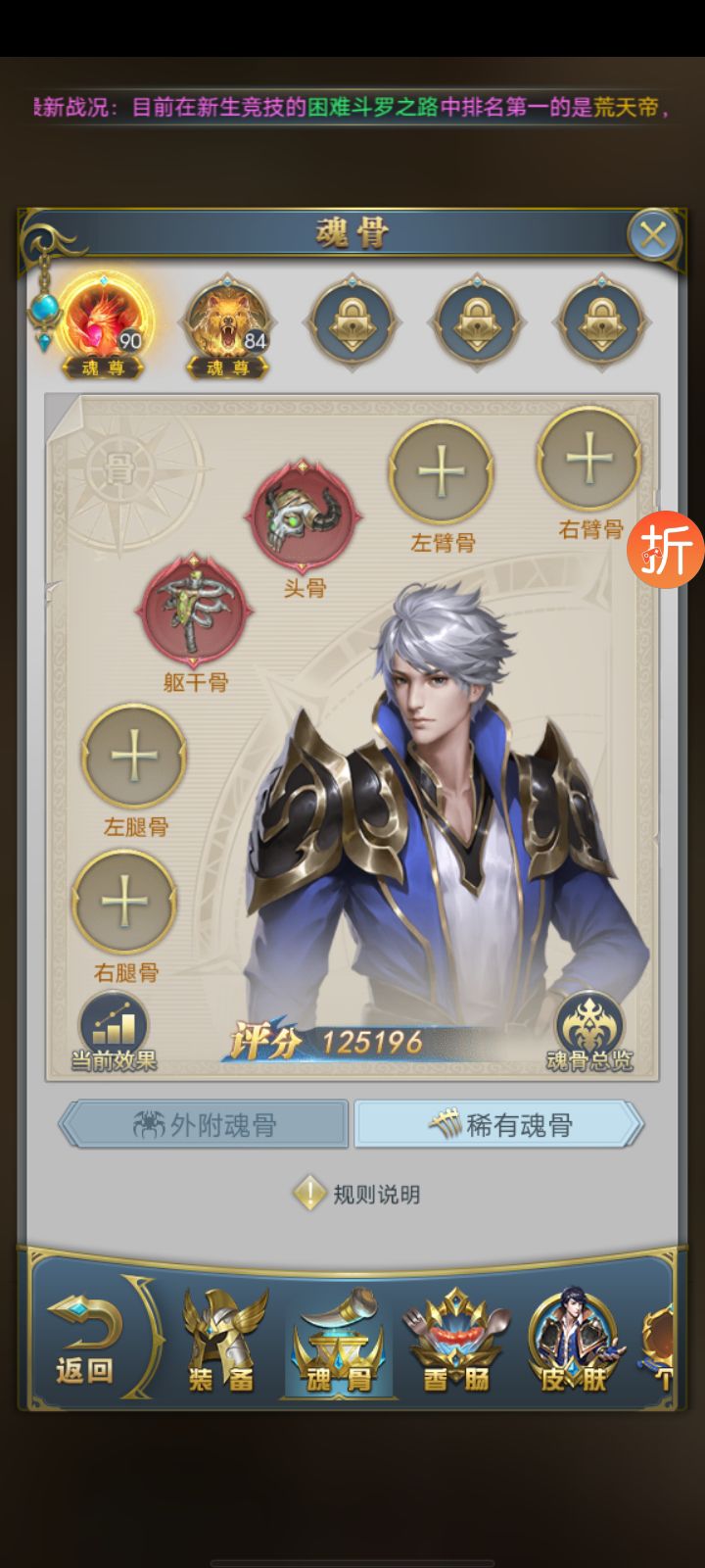 卖家描述: 84万战力一颗魂兽内丹,两块十万年魂骨,坐骑泰坦巨猿,烈火金甲犀,雷鸣爆虎