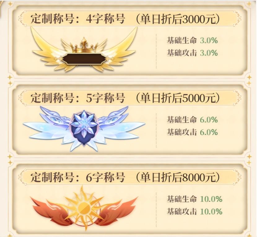 ③单日折后实充达标8000元,玩家可自定义6个字进行称号定制;