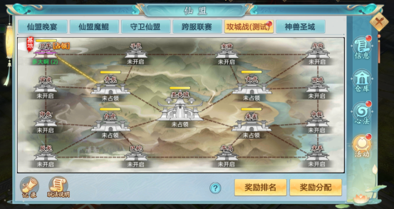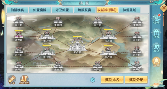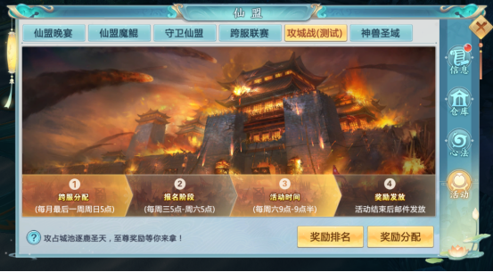首先,攻城战是一个超高奖励的跨服玩法,攻城战每周六晚21 : 00-21 : 30开启,等级达到350级且拥有阵营的玩家均可参与。攻城战——仙盟奖励、个人奖励、城池奖励均有安排。城池分十二星城,四象城和太极城三种,级别越高,占领城池获得奖励越丰厚。