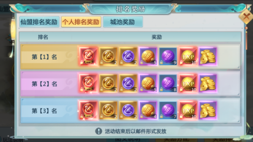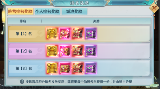 根据阵营总积分排名发放对应的阵营奖励(阵营内每个仙盟各自获得一份), 奖励发放后由仙盟盟主分配。