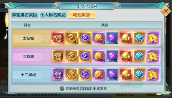 【城池奖励】活动结束后,根据本阵营占领的城池,发放对应的奖励,未参加活动的玩家无法获得奖励。您的所在的阵营占领了哪些城池,您就可以获得对应的奖励的叠加。如,您的阵营,占领了3个城池十二星城、一个城池四象、还有一个城池太极。您可以获得的奖励就有以下5份奖励=3份星城奖励+1份四象城奖励+1份太极奖励,这个奖励简直太好啦!