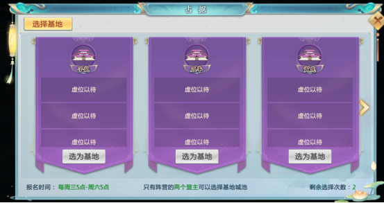 每周三5点-周六5点,阵营内两个盟主可以选择基地城池(十二星城之一),每个基地城池可以被四个阵营选择座位基地。(即便是报名选择的基地活动开始也是需要去争夺的获得占领权的)