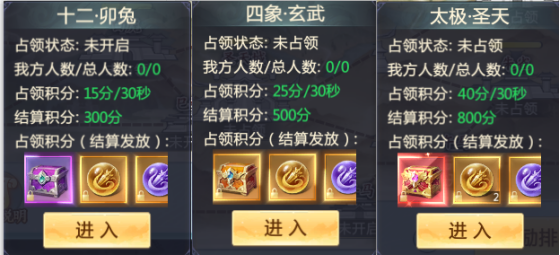 如,指定好攻打顺序,(与本阵营有连线的城池才可攻打)是先打连线上的其他阵营城池还是四象。后期要是占领了四象城拥有了与太极城的连线,即可攻打圣天城。高级城池占领获得的积分是比其他城池高很多的,各种城池带来的占领积分、结算积分、占领奖励都是不同的。(具体如下图)