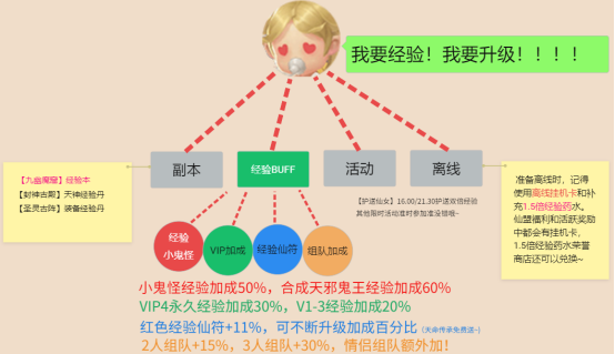 准时参与日常活动,赢取活动参与奖励。优先完成主支线任务后,再去参与经验副本、仙女护送和悬赏任务,离线前别忘了选择推荐挂机点使用挂机卡换上小鬼怪吃上1.5倍经验药哦~