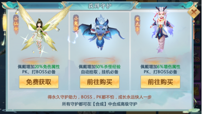 其次,V4背包守护第二孔位免费开,一定要结合开服0元购活动,再白嫖一个守护小仙女(增加加20%免伤属性),PK、打BOSS必备~