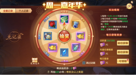 开服半小时系统免费赠送体验VIP1十天,每天登陆+5点VIP经验。开服第四天开启周一转盘,每日登陆和达到活跃点即可获得周一抽奖券,自定义设定特等奖为VIP体验卡(7天),就可以一直续费您的VIP。只要你够活跃,每日登陆并且完成指定的任务,从VIP1一直提升到V2、V3,乃至V4都是没有问题的~~~